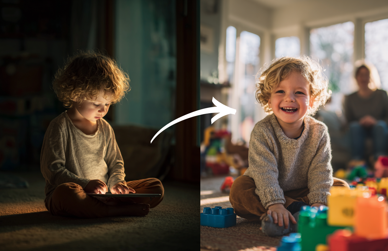 Watch your child's eyes light up again when they see you - just like they used to before screens took over. This gentle approach helps you reconnect with your little one's heart while naturally reducing their need for screens.